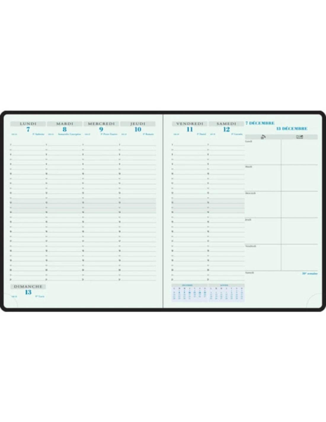 - Un classique à la matière légèrement veinée, couverture amovible en plastique. La semaine de 6 jours (lundi-samedi inclus – petit em placement sans horaire pour le dimanche) sur 2 pages, grille verticale, horaires de 7h à 21h, rdv par 1/2 heure, édition française. 13 mois.
