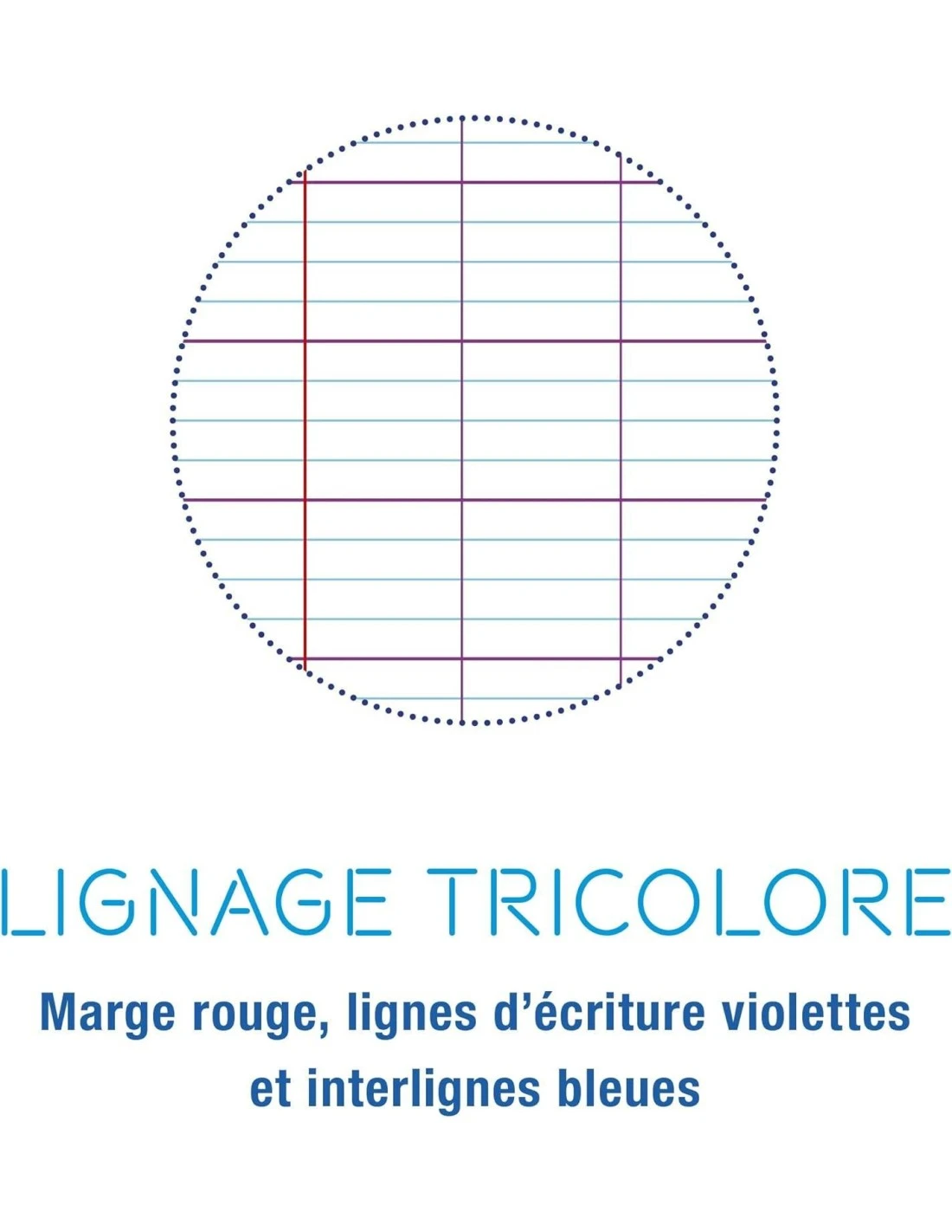 - RÉGLURE TRICOLORE : marge rouge, lignes violettes et interlignes bleues, pour un meilleur confort d’écriture