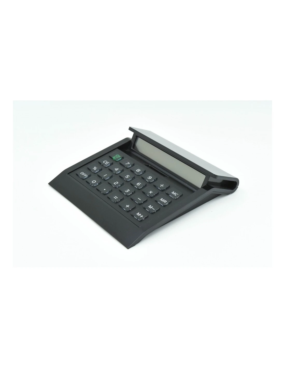 Calculatrice noir de bureau avec alimentation par pile ou énergie solaire.
