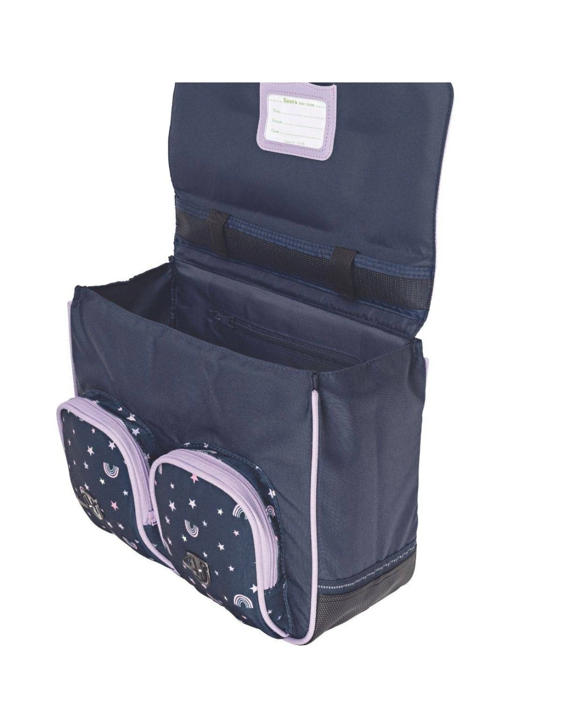 Avec son message positif « Be Happy » et son trio de patchs gomme, il apporte une dose quotidienne de bonne humeur. Les deux poches avant sont ornées d’un magnifique motif mêlant étoiles et arc-en-ciel, ajoutant une touche magique à ce cartable déjà si spécial.