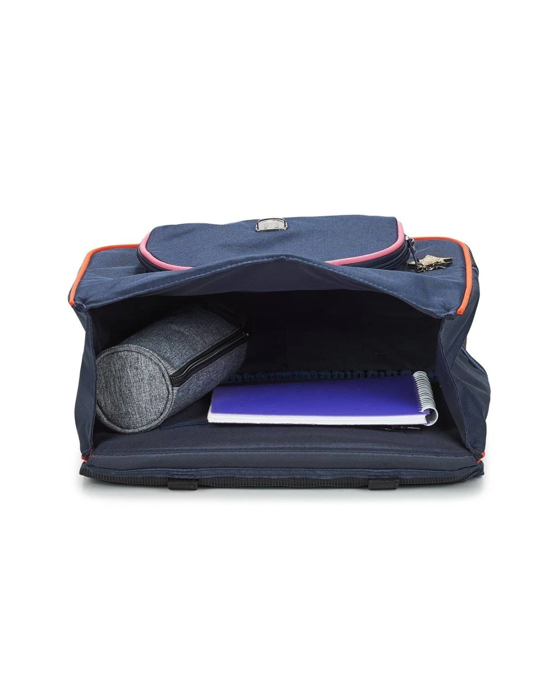 Le cartable Leila offre un compartiment doublé pouvant accueillir aussi bien une trousse et un cahier de texte que des petits livres et des grands cahiers A4 et 24 x 32.