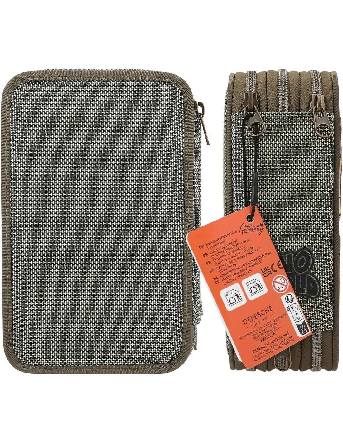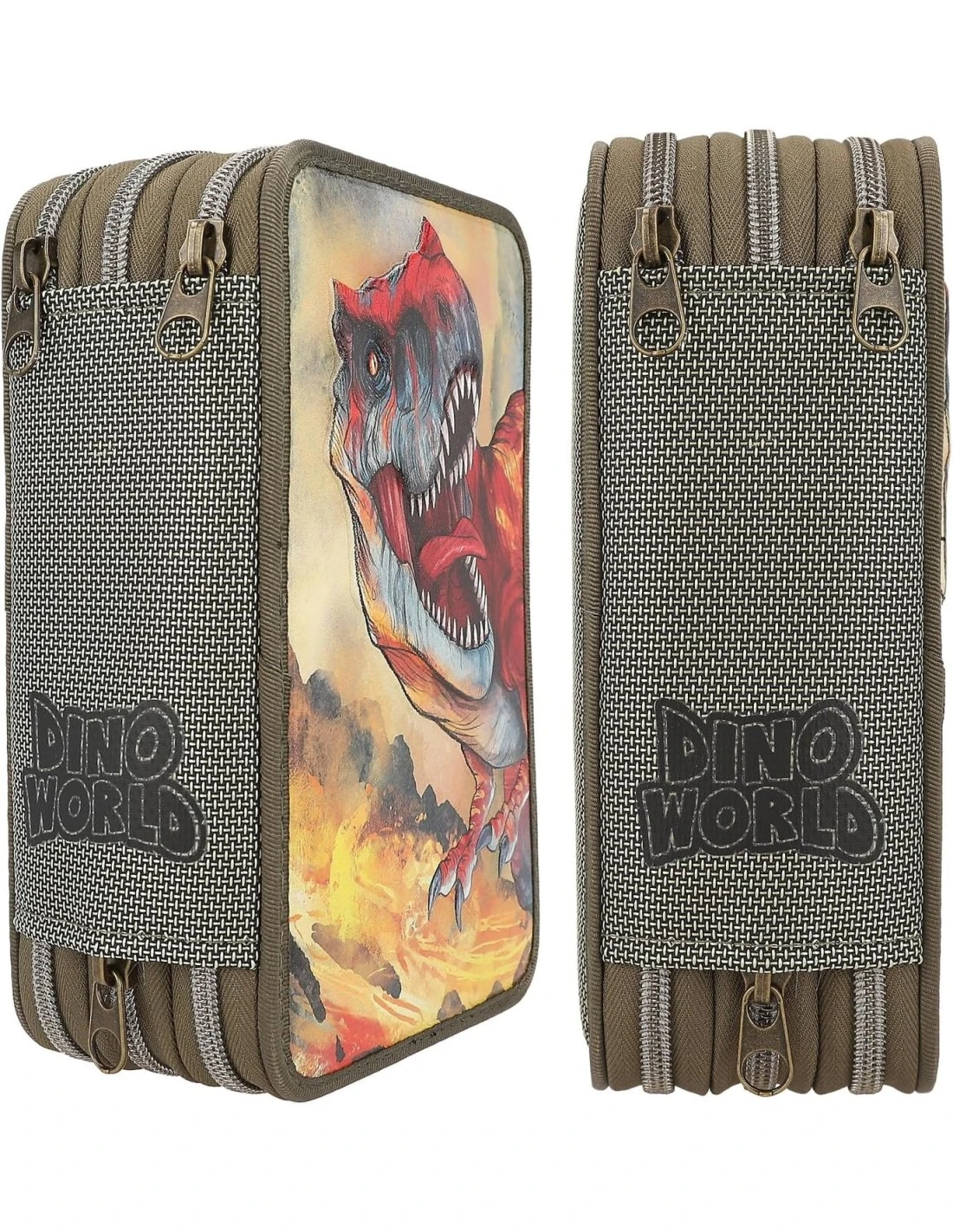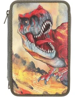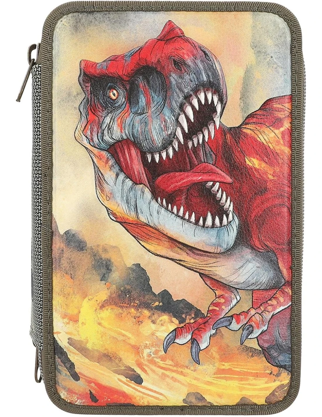 T. rex total ! Le devant de cette trousse de couleur olive de Dino World présente un grand motif dinosaure sur fond lave brûlante.