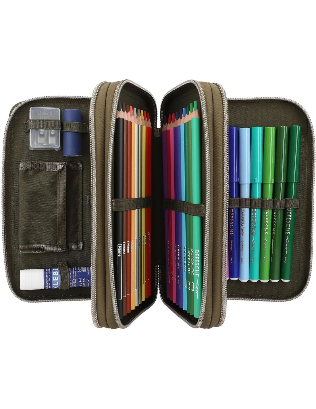 Les trois compartiments séparés sont remplis de 18 crayons de couleur et 18 feutres, 2 crayons à papier, un taille-cravon, une gomme, une règle, des ciseaux, un bâton de colle et une petite pochette à fermeture velcro.