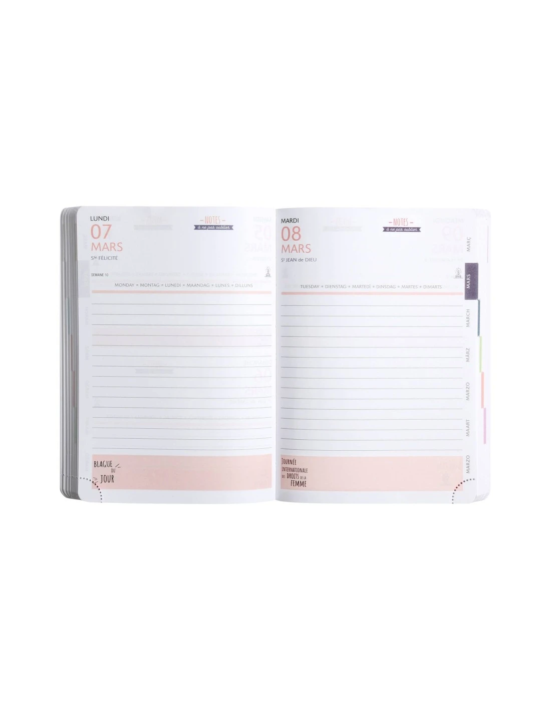 - Agenda imprimé sur papier blanc Clairefontaine, reconnu pour sa qualité et pour permettre une écriture douce et fluide – coins détachables, pour pouvoir accéder rapidement au jour en cours.