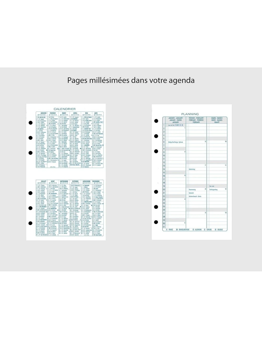- La semaine sur 2 pages à la verticale – amplitude horaire du lundi au vendredi 8h à 20h, samedi 8h à 13h et espace de notes pour le dimanche. Papier blanc impression en bleu et gris
