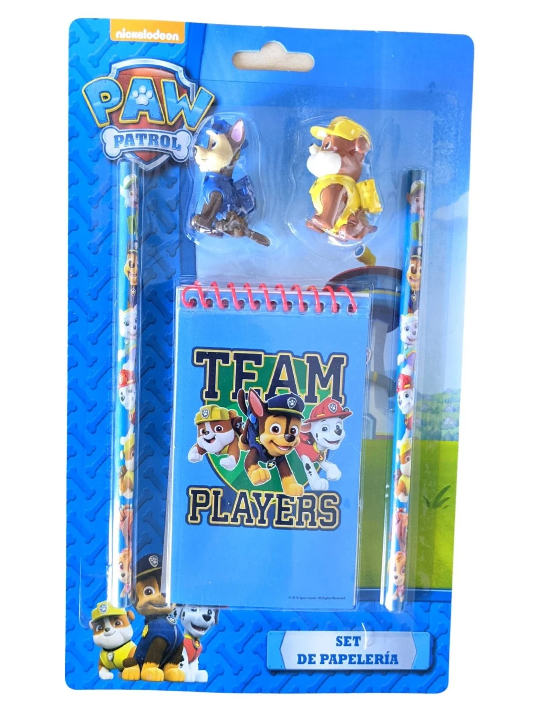 Kit de papeterie Paw Patrol, 2 crayons à papier, 1 carnet et 2 figurines.