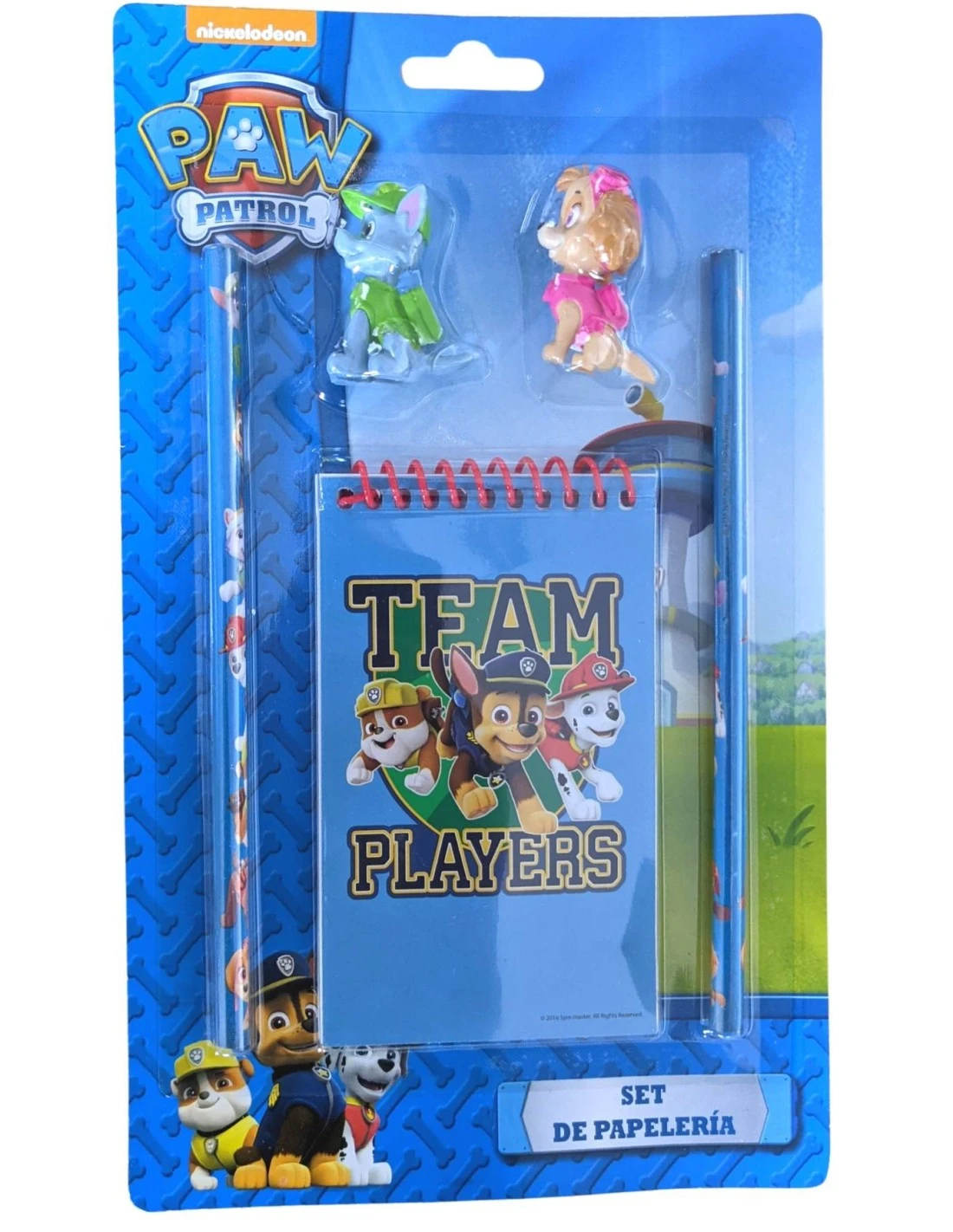 Kit de papeterie Paw Patrol, 2 crayons à papier, 1 carnet et 2 figurines.