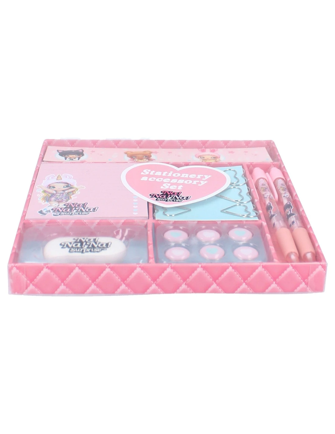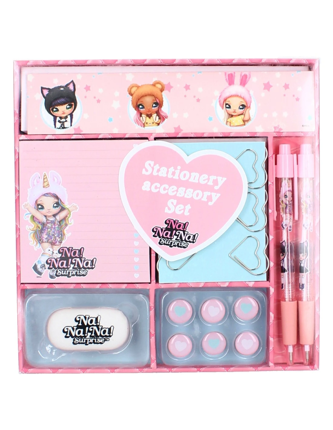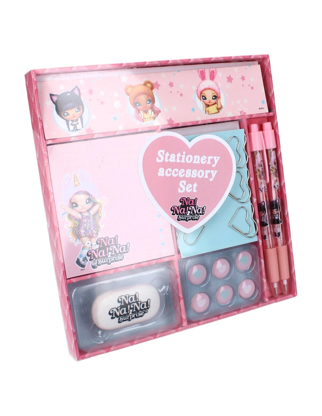 Set d’écriture composé de 2 stylos, de 6 trombones, d’un bloc-notes, de 6 trombones coeur, d’une gomme et de 6 punaises.