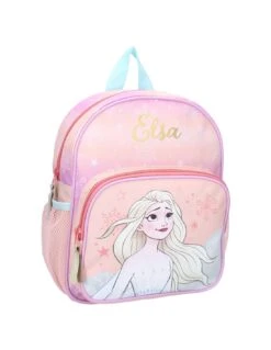 - Design enchanteur: Le sac à dos est de couleur rose avec une illustration d’Elsa sur le devant, entourée de détails roses et bleus.