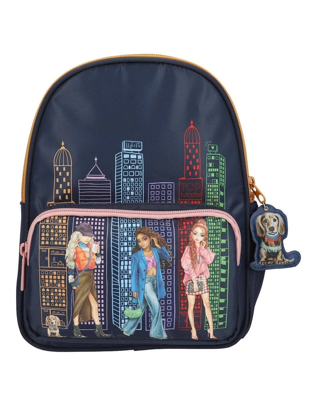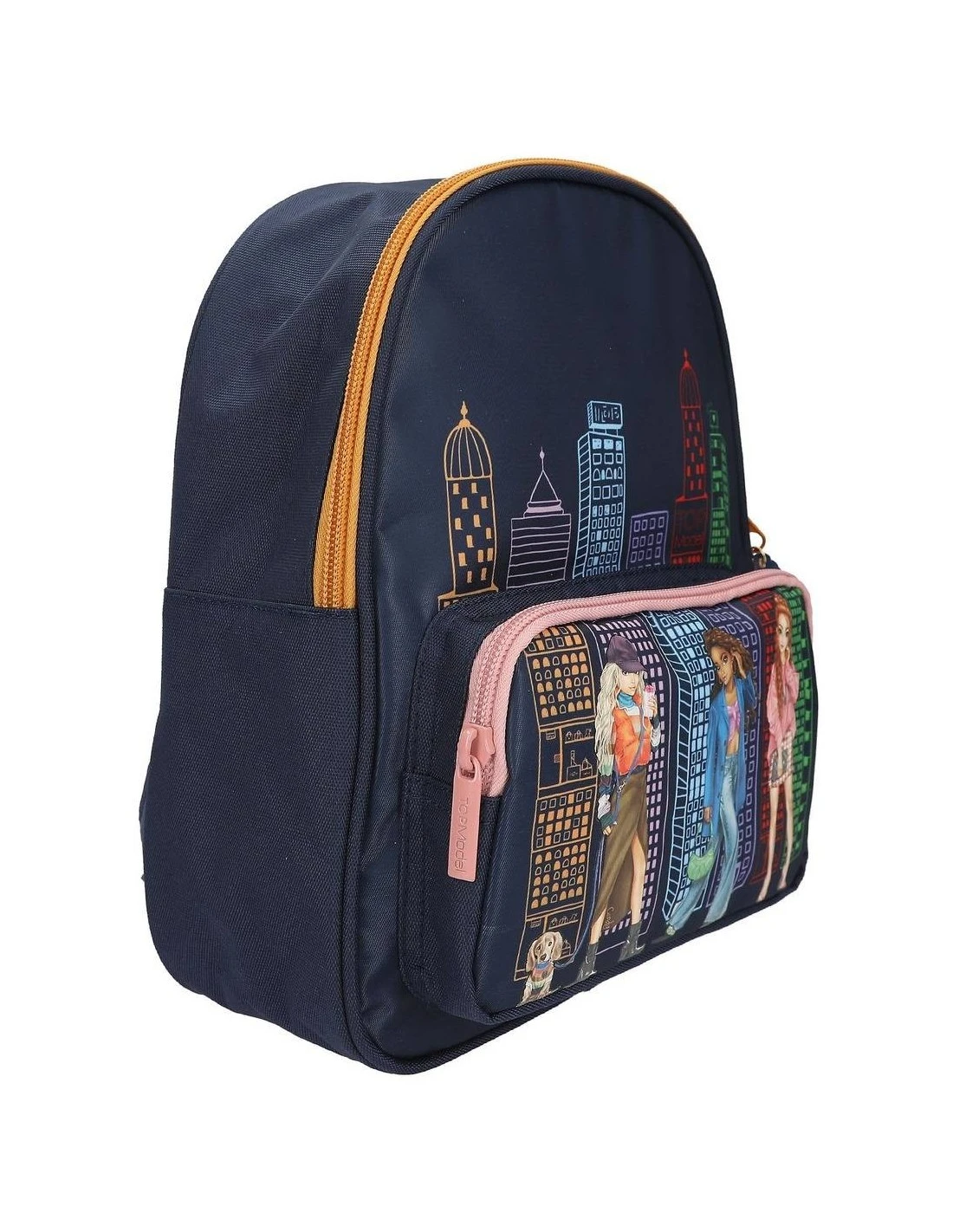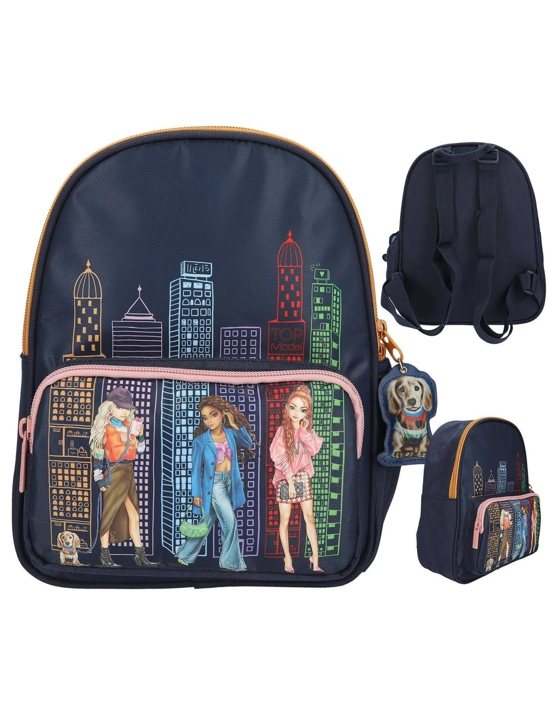 Un style urbain cool : le devant de ce sac à dos TOPModel bleu foncé présente un grand motif 3 mannequins en couleurs rayonnantes, ainsi qu’une silhouette colorée de ville.