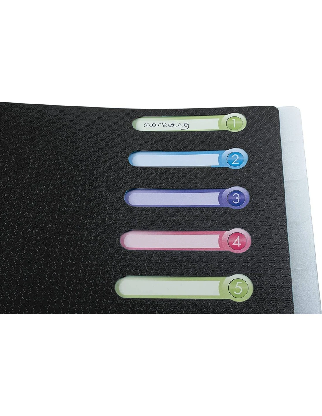 Personnalisation facilitée des compartiments grâce aux fenêtres découpées dans la couverture et à la pochette A4 située en 2e de couverture.*